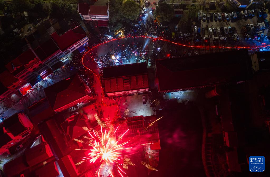 2月19日,在澧浦鎮下宅村,村民們抬著100多節長的傳統板凳龍在村落中穿行,與燃放的焰火組成了美麗的年俗畫面(無人機照片)。