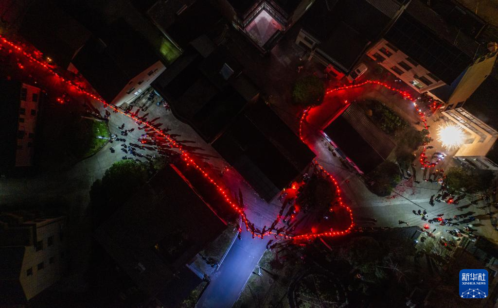 2月19日,在澧浦鎮里新村,村民們抬著長長的傳統板凳龍在村落中穿行(無人機照片)。