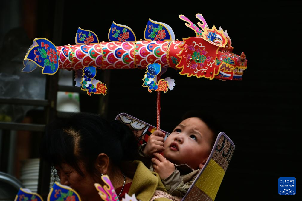 2月20日,一名小朋友在貴州省石阡縣仡佬毛龍節毛龍巡游活動中舉起紙龍。