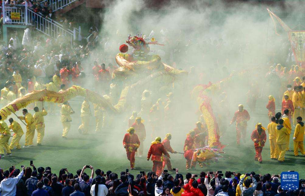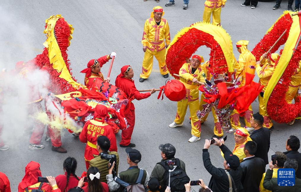2月20日,人們在觀看貴州省石阡縣仡佬毛龍節舞龍大賽。
