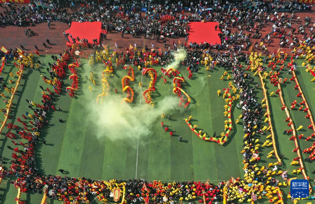 這是2月20日拍攝的貴州省石阡縣仡佬毛龍節賀新春活動現場(無人機照片)。