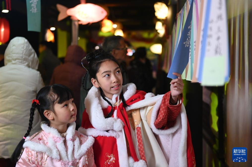2月21日,小朋友在南潯區菱湖鎮秀溪水街的長廊里猜燈謎。