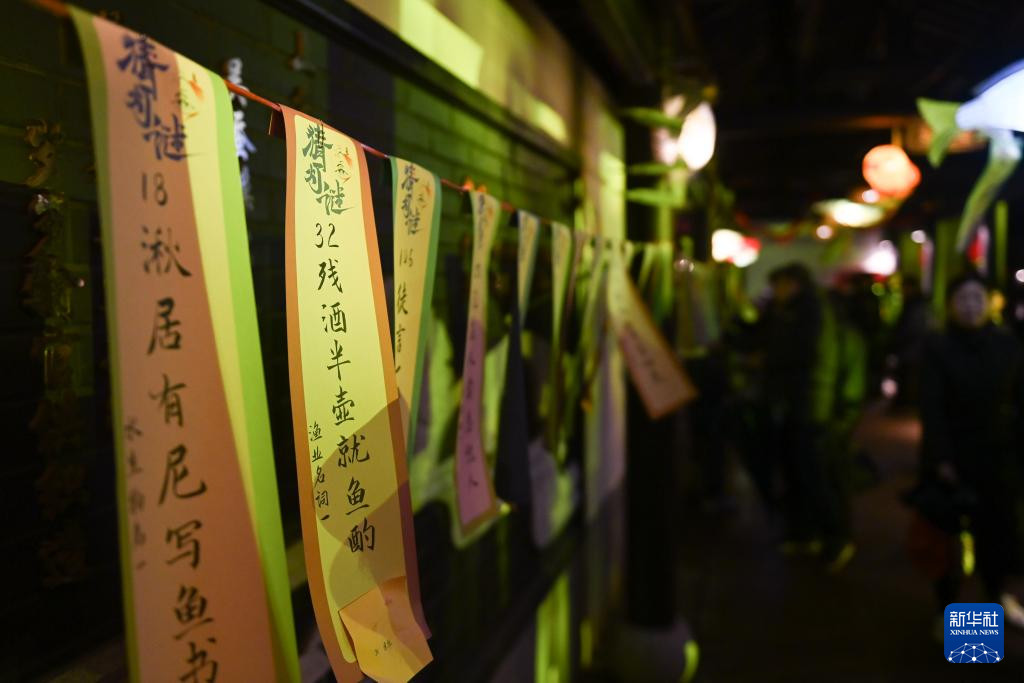 2月21日,人們在南潯區菱湖鎮秀溪水街的長廊里猜燈謎。