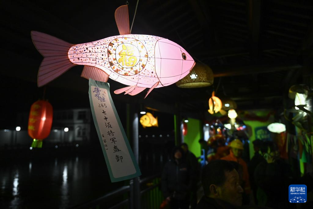 2月21日,人們在南潯區菱湖鎮秀溪水街的長廊里賞魚燈、猜燈謎。