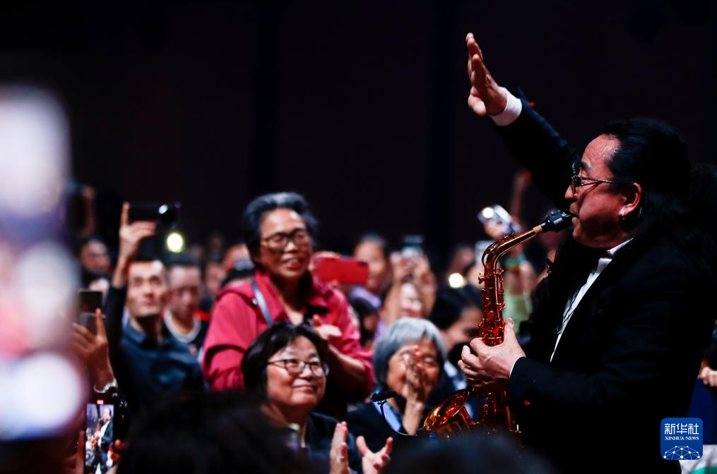 2月21日,薩克斯演奏者劉家軍在澳大利亞悉尼“四海同春”訪演活動上與現場觀眾互動。