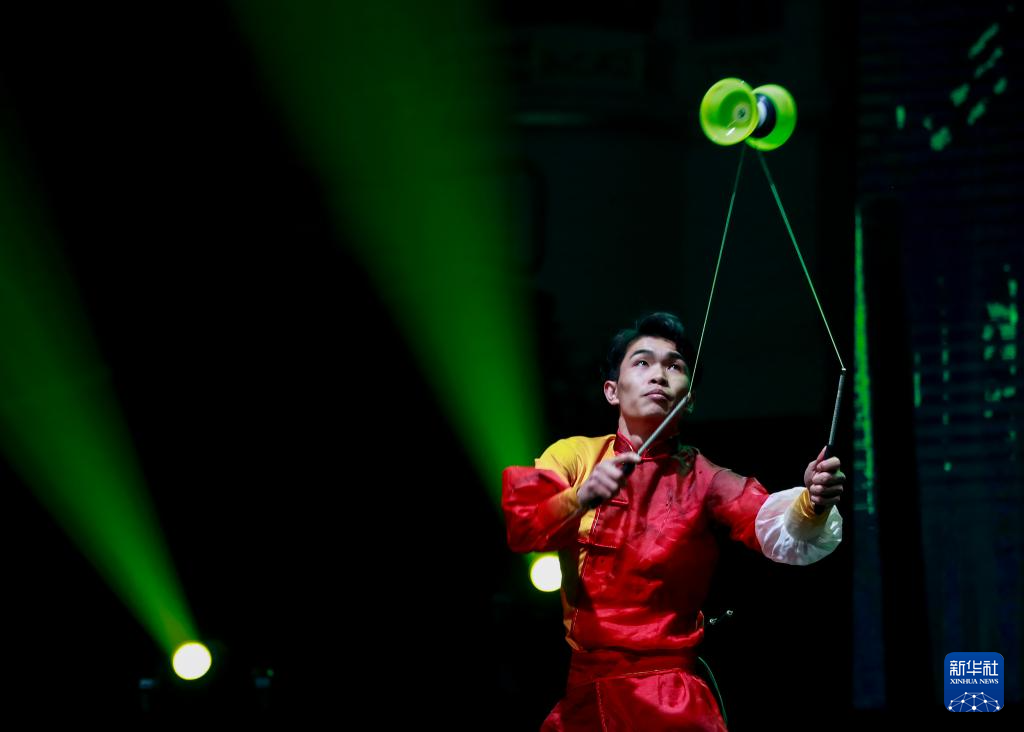 2月21日,演員延翔宇在澳大利亞悉尼“四海同春”訪演活動上表演雜技《十面埋伏》。