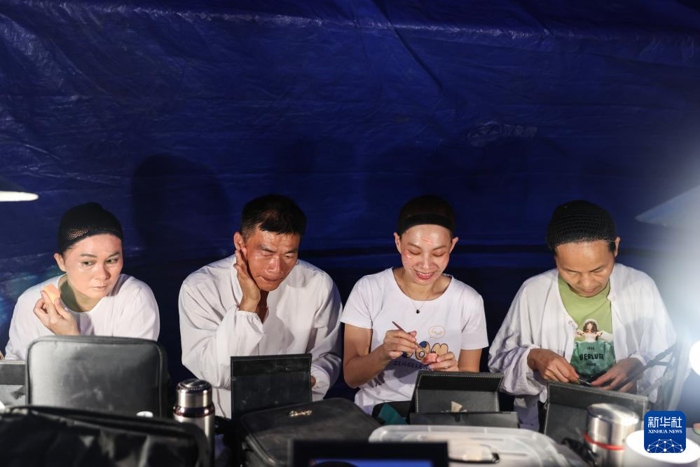 2月21日,海南定安縣瓊劇團的演員們在定安縣后山村演出前化妝。