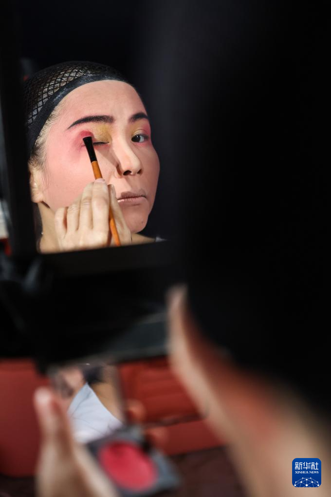 2月21日,海南定安縣瓊劇團的演員在定安縣后山村演出前化妝。
