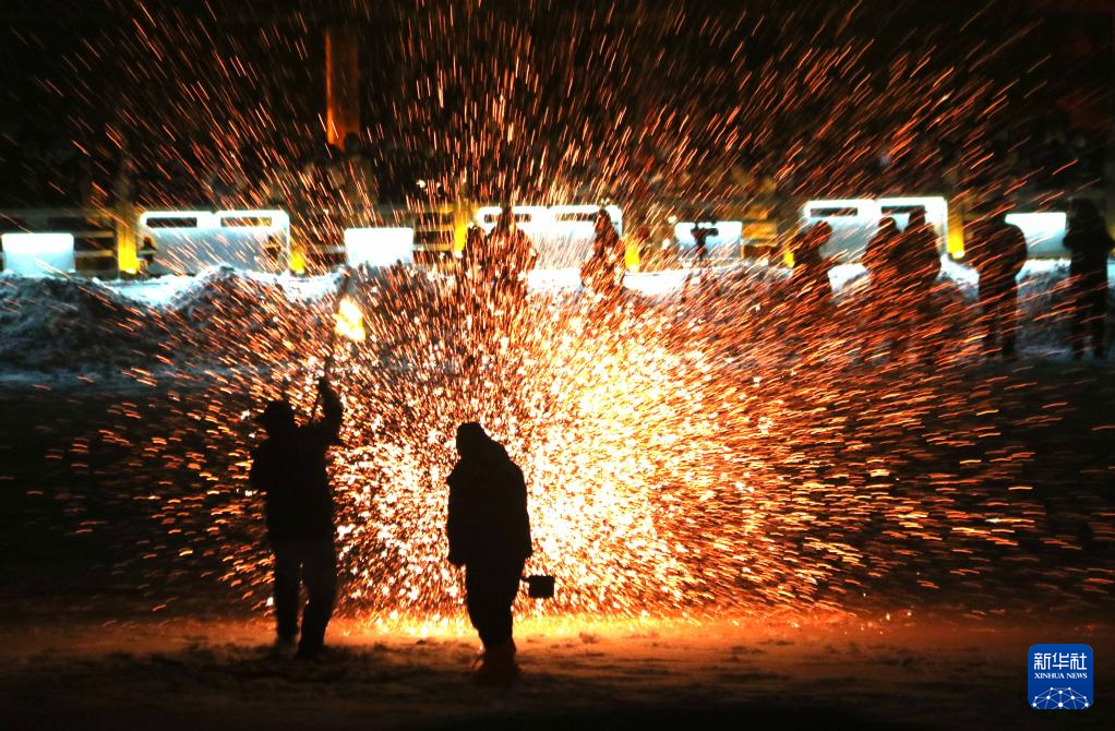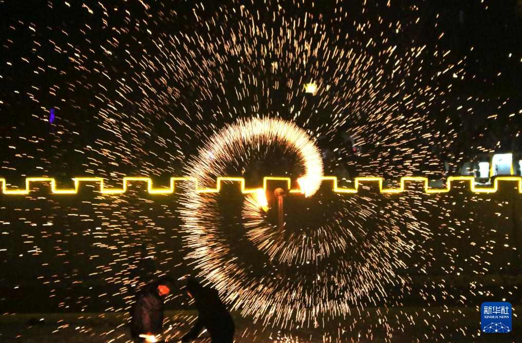 2月21日,在敦煌市黨河風情線,民間藝人進行打鐵花民俗表演。