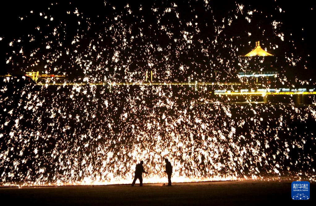 當晚,甘肅省敦煌市在黨河風情線舉行“火樹銀花 瑞龍迎春”打鐵花民俗展演活動,喜迎元宵佳節,吸引眾多市民游客前來觀賞。