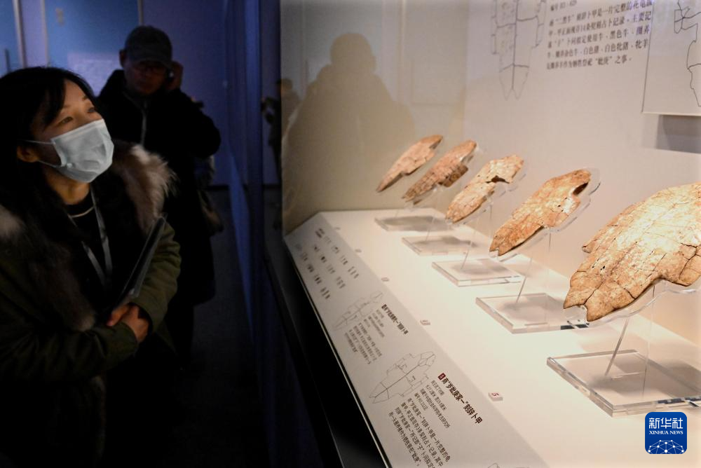2月26日,參觀者在河南安陽殷墟博物館新館內觀看展出的刻辭卜甲。