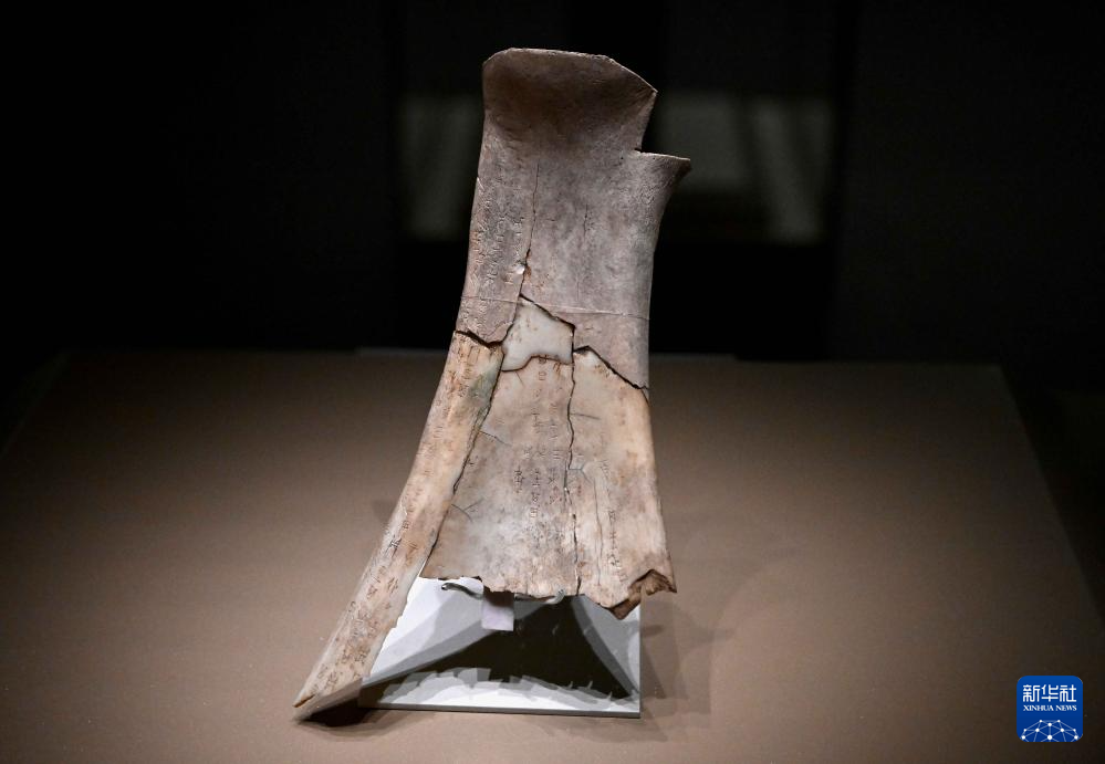河南安陽殷墟博物館新館內展出的刻辭卜骨(2月26日攝)。