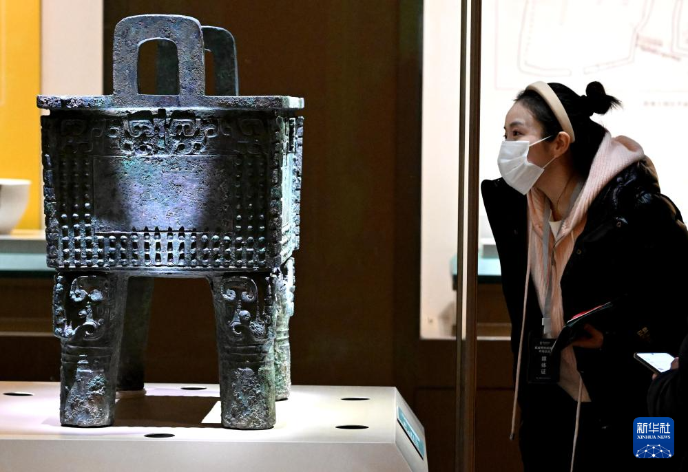 2月26日,參觀者在河南安陽殷墟博物館新館內觀看展品“司母辛”銅鼎。
