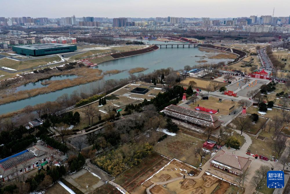 這是隔河相望的河南安陽殷墟宮殿宗廟遺址(右)與殷墟博物館新館(無人機照片,2024年2月23日攝)。新華社記者 李安 攝