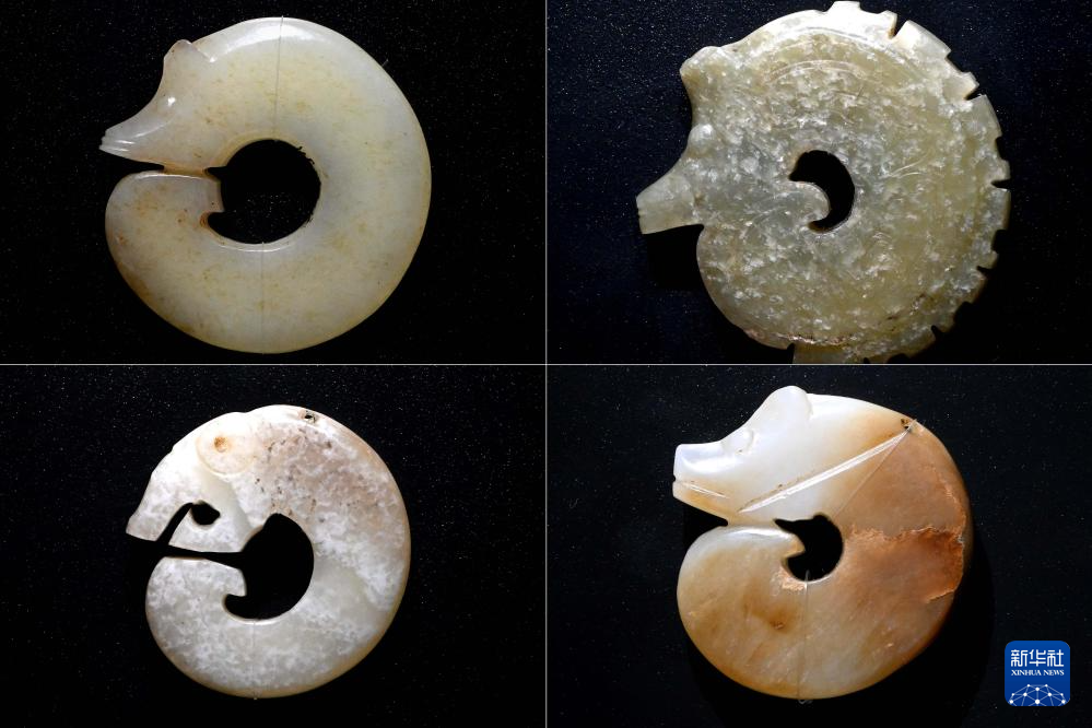 這是河南安陽殷墟博物館新館內展出的龍形玉玦(拼版照片,2024年1月9日攝)。新華社記者 李安 攝
