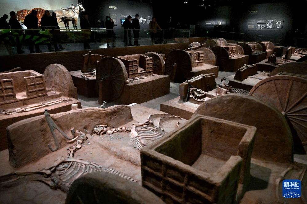 2024年2月26日,參觀者在河南安陽殷墟博物館新館內觀看車馬遺跡。新華社記者 李安 攝