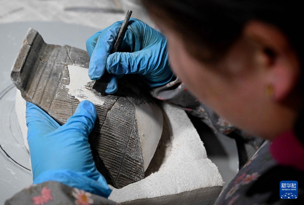在中國社會科學院考古研究所安陽工作站,工作人員在對殷墟洹北商城出土的陶片進行整理修復(2024年2月23日攝)。新華社記者 李安 攝