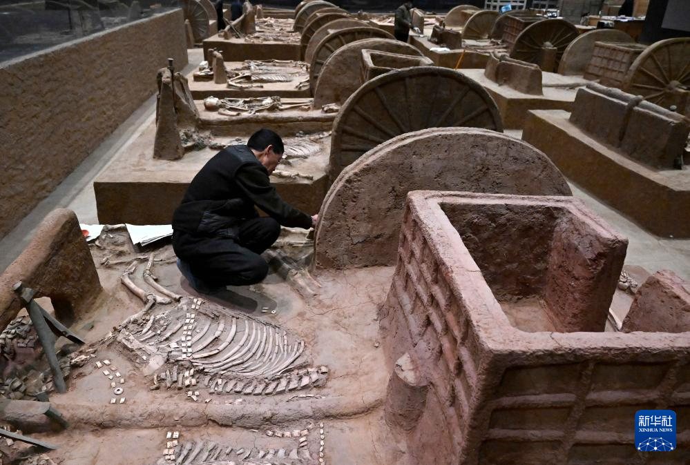工作人員在河南安陽殷墟博物館新館的展廳內修復車馬遺跡(2024年2月23日攝)。新華社記者 李安 攝