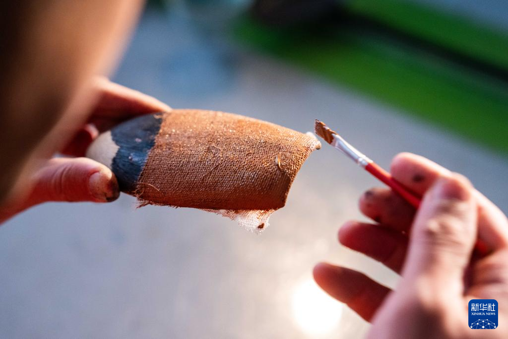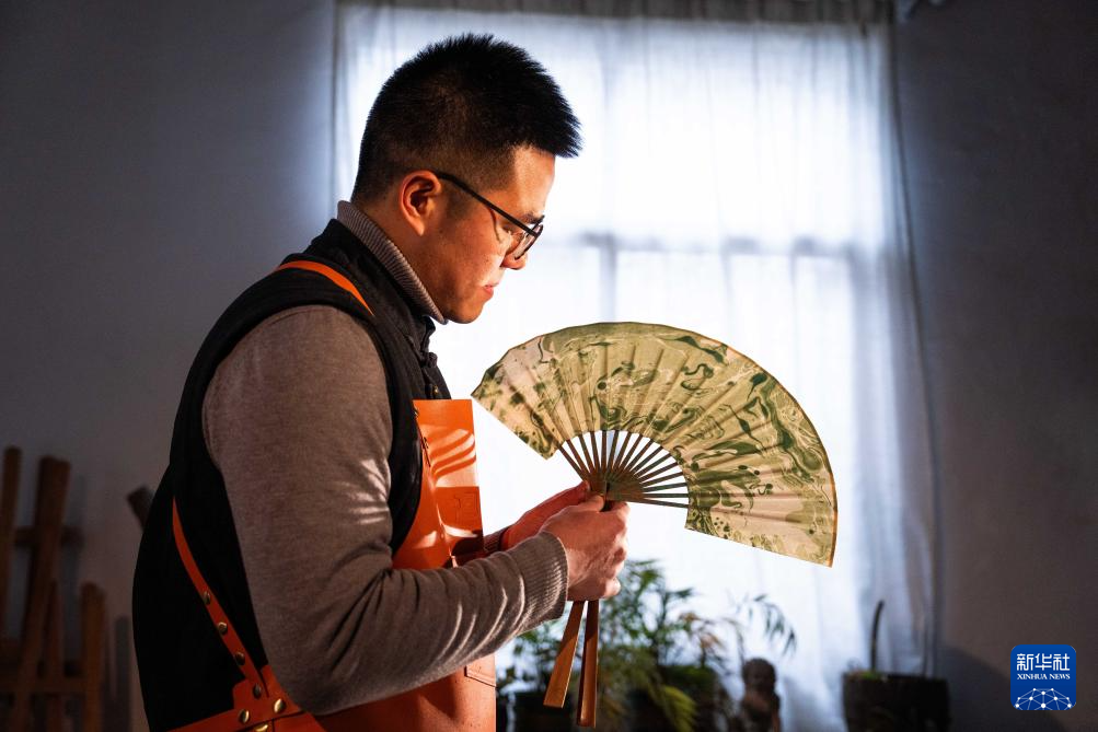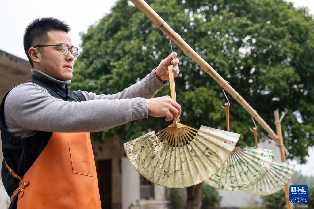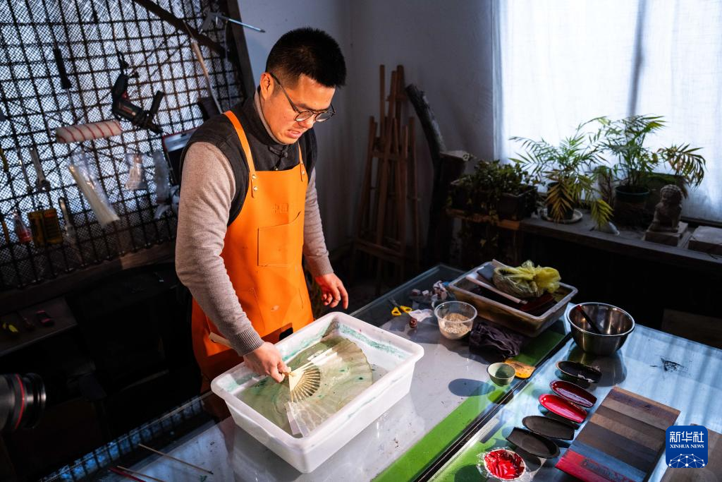 2月28日,郝冠雄在晾曬制作的漆扇。