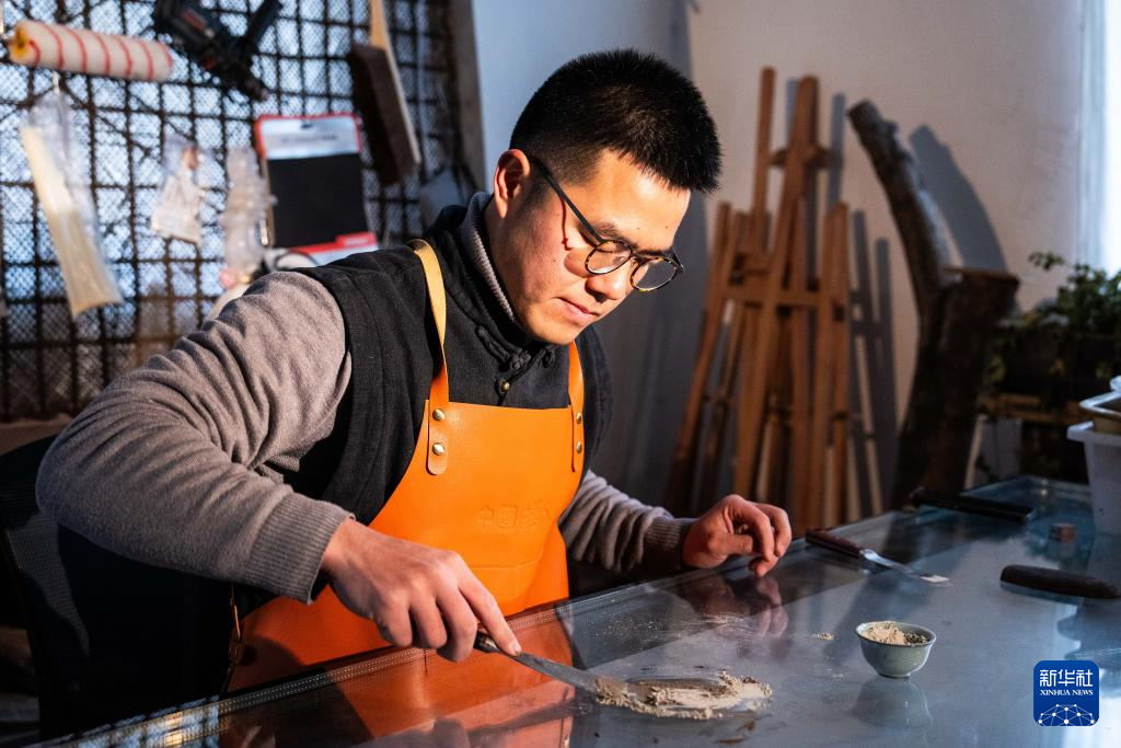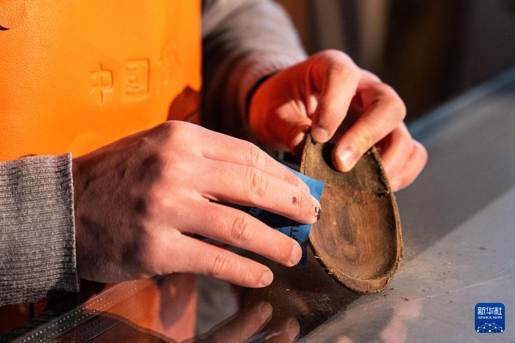 2月28日,郝冠雄在擦漆,為的是讓大漆充分滲透到木胎里。