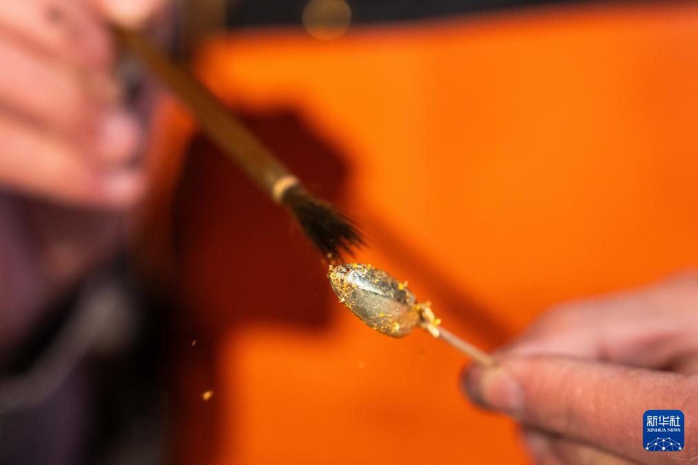 2月28日,郝冠雄給大漆瓜子吊墜包金箔。