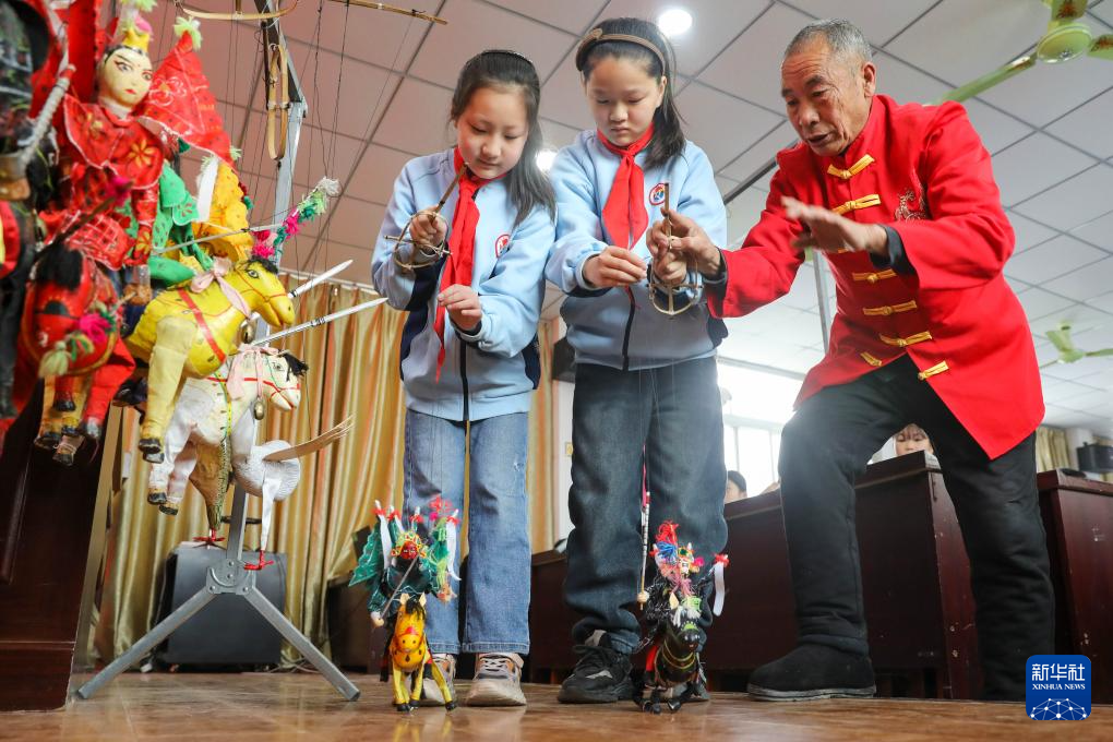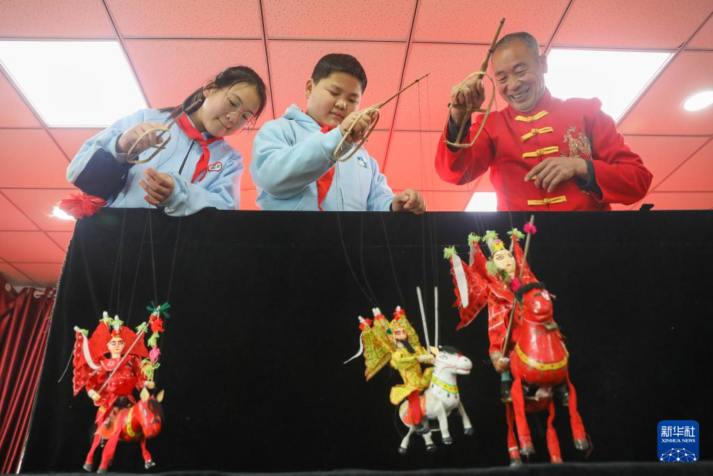 3月7日,河南省寶豐縣山河路小學的學生在學習提線木偶戲表演。