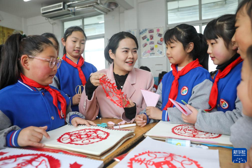 3月7日,河南省寶豐縣山河路小學的老師在教學生剪紙。