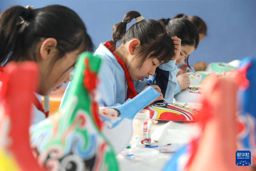 3月7日,河南省寶豐縣山河路小學的學生在繪制馬勺臉譜。