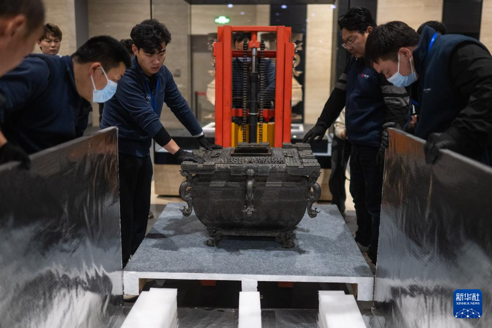 在湖北省博物館,工作人員在對文物銅鑊鼎進行打包裝箱(3月4日攝)。