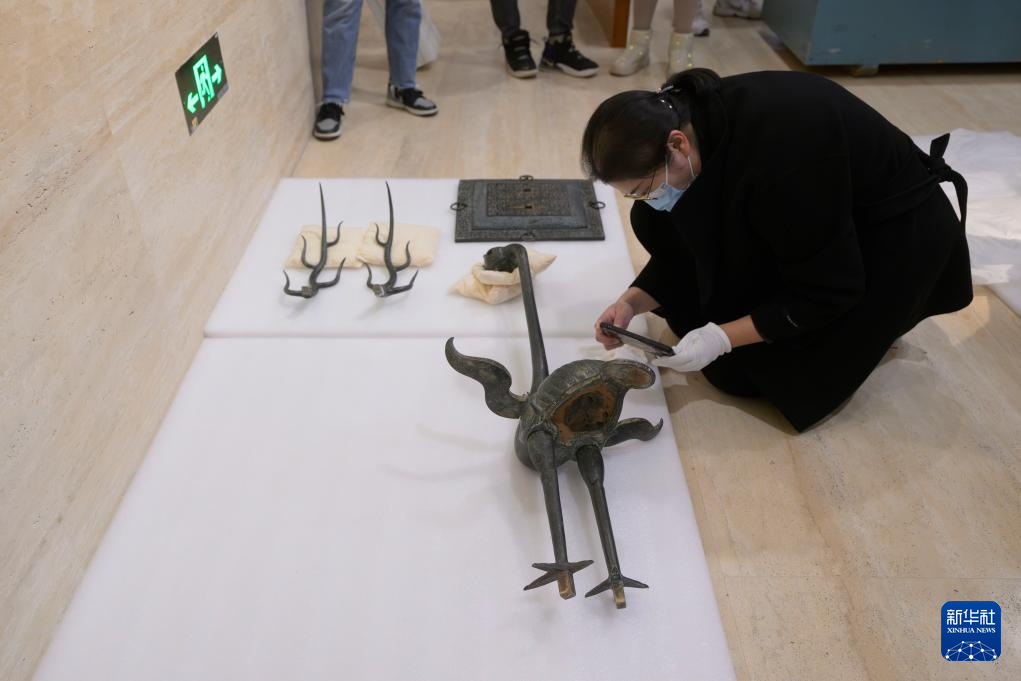 在湖北省博物館,工作人員在對文物銅鹿角立鶴進行點交(3月4日攝)。
