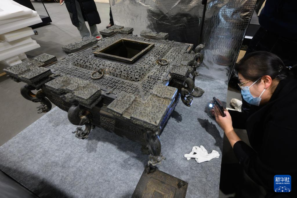 在湖北省博物館,工作人員在對文物銅鑒缶進行點交(3月4日攝)。