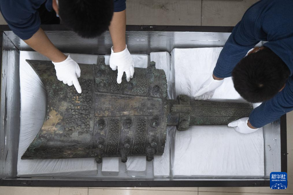 在湖北隨州博物館,工作人員對曾侯與甬鐘進行打包(2月27日攝)。
