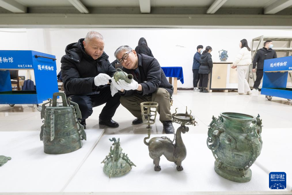 在湖北隨州博物館,工作人員對展出的文物進行點交(2月27日攝)。