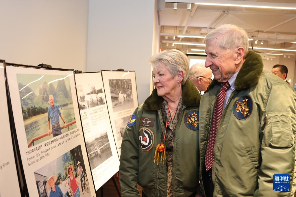 3月11日,美中航空遺產基金會副主席金坎農(左)及其丈夫身著飛虎隊制服在美國紐約參觀“中美友好在廣西”圖片展。