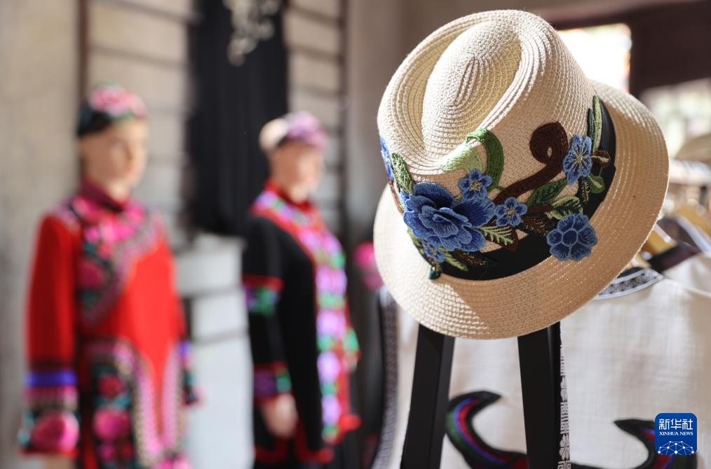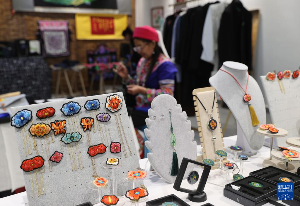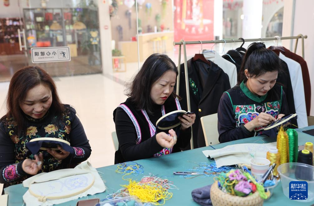 3月13日,在云南省雙柏縣特色產業一條街,“繡娘”在店內制作繡品。