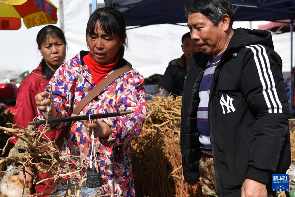 3月19日,在安仁縣中草藥交易集市,商家(中)為消費者挑選的中草藥稱重。