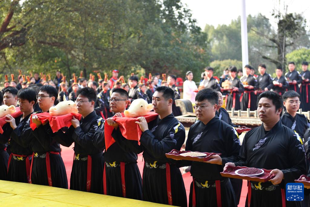 3月20日,在安仁縣2024年祭祀炎帝神農典禮現場,祭祀人員向神農炎帝敬獻貢品。