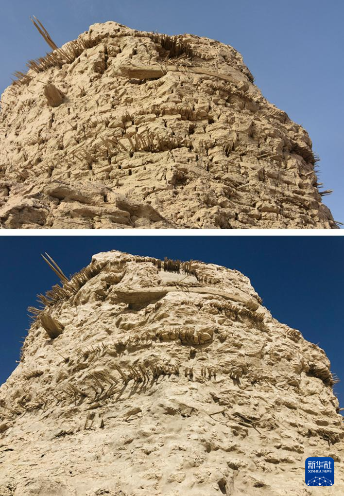這是一張拼版照片,上圖為搶險加固前的佛塔遺址局部(2019年11月14日攝);下圖為搶險加固后的佛塔遺址局部(2020年10月20日攝)。新華社發(中鐵西北科學研究院有限公司供圖)