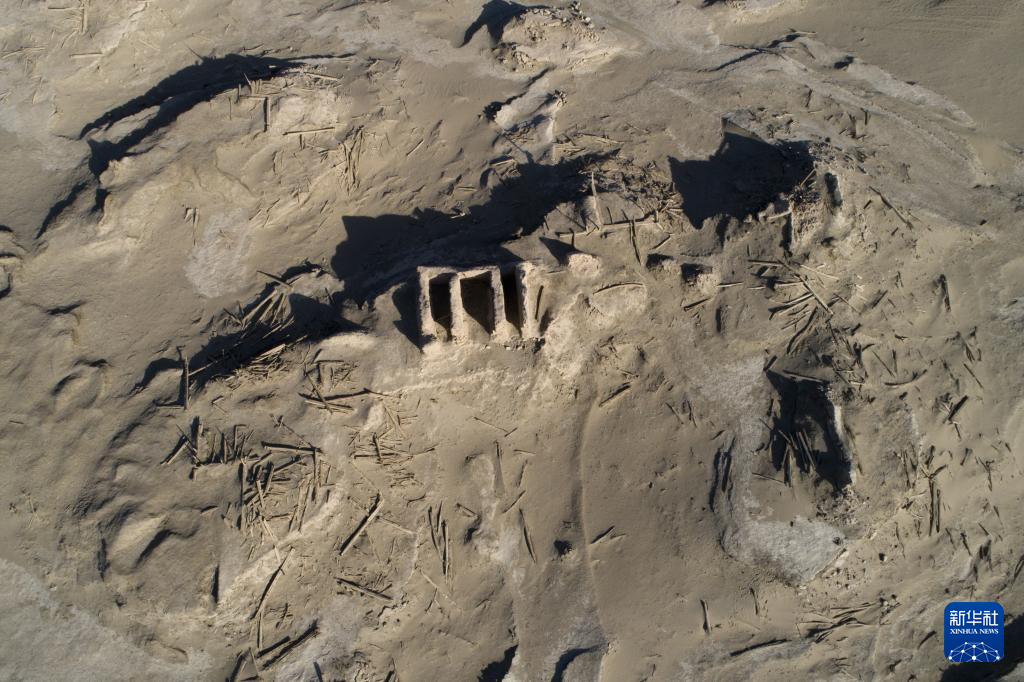 如今的樓蘭遺跡輪廓依稀可辨。通過航拍俯瞰,可見城郭基本為方形,占地面積10.8萬平方米。樓蘭故城東北區,坐落著殘高約10.4米的佛塔遺址,不遠處有一處官署遺存,考古工作人員叫它“三間房”。雖經風沙侵蝕,遺跡依稀可見,房屋用土塊壘砌,東西兩間較狹小,中間一間較寬大,形制規格較高,布局嚴謹。