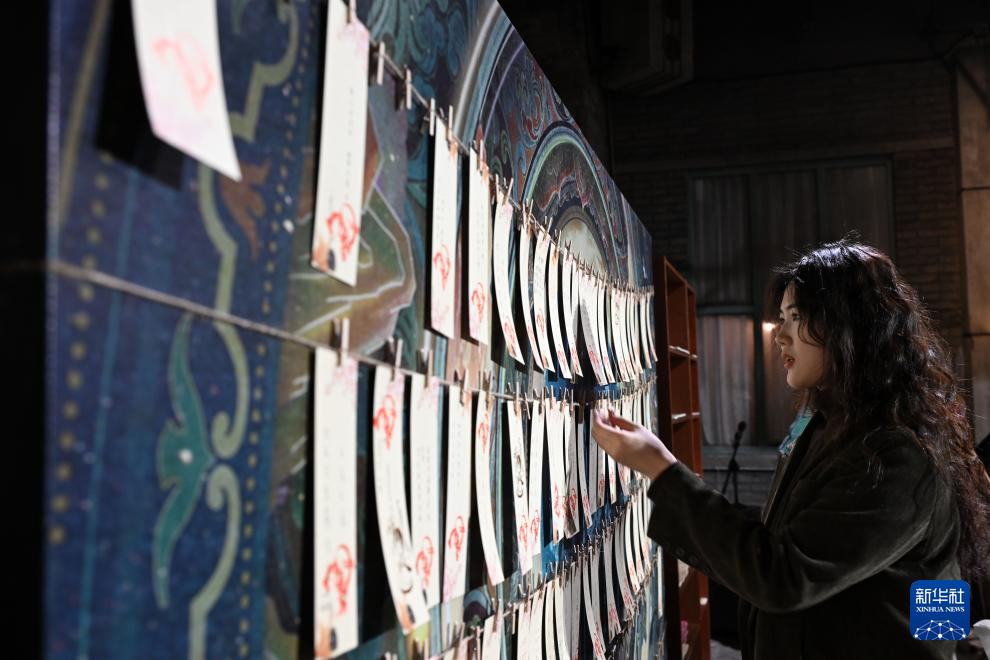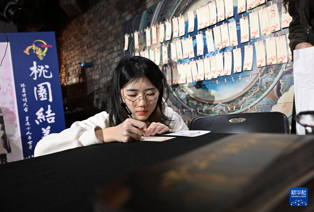 3月24日,一名女孩在懸掛自己書寫的詩詞書簽。