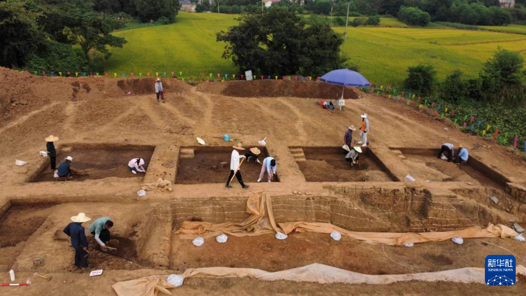 2023年9月23日,考古人員在磨盤山遺址發掘現場(無人機照片)。