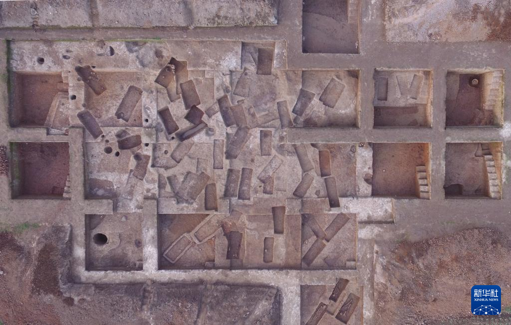 圖為磨盤山遺址馬家浜文化晚期房址發掘現場(2023年12月1日攝,無人機照片)。