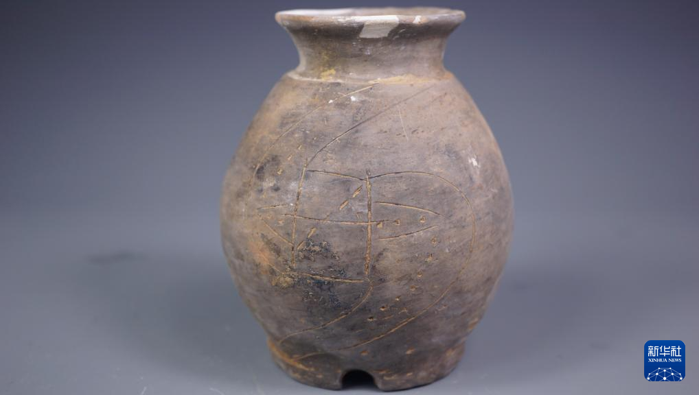 圖為磨盤山遺址出土的崧澤文化時期帶有圖畫刻劃的壺。