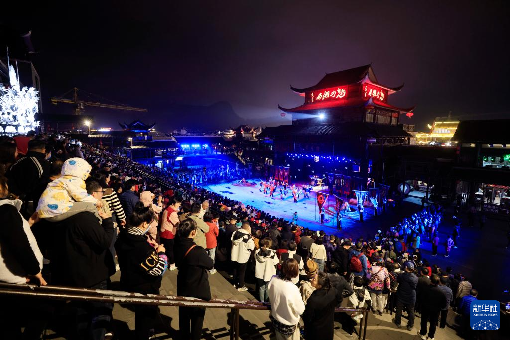 民俗大戲《魅力湘西》是湖南張家界“夜經濟”的代表文化作品。今年以來,湖南張家界《魅力湘西》演藝團隊對節目舞美編排、燈光音效等進行提質優化,創新多種方式展現湘西地區的風俗民情及特色文化,帶給觀眾全新的視聽體驗。