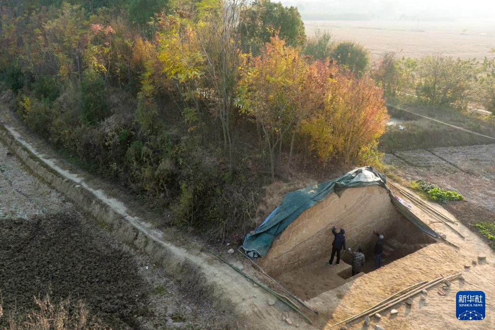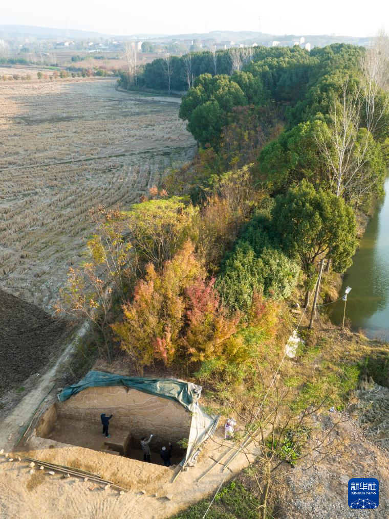 2023年12月4日,考古人員在湖北荊門屈家嶺遺址鄭畈水壩現場進行考古工作(無人機照片)。