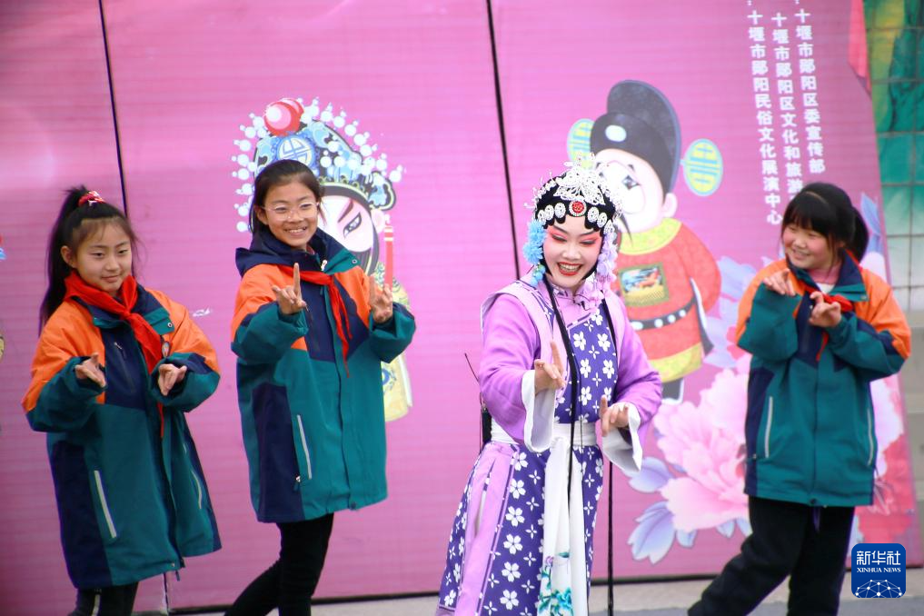 3月26日,山東省棗莊市東湖小學戲劇社團的學員在為同學們表演柳琴戲。