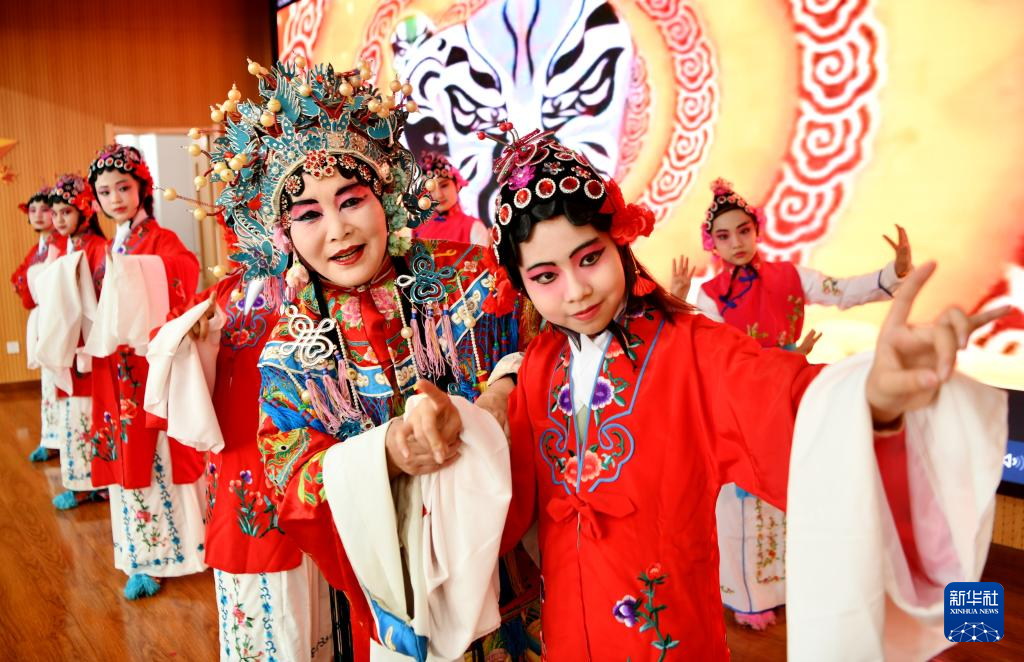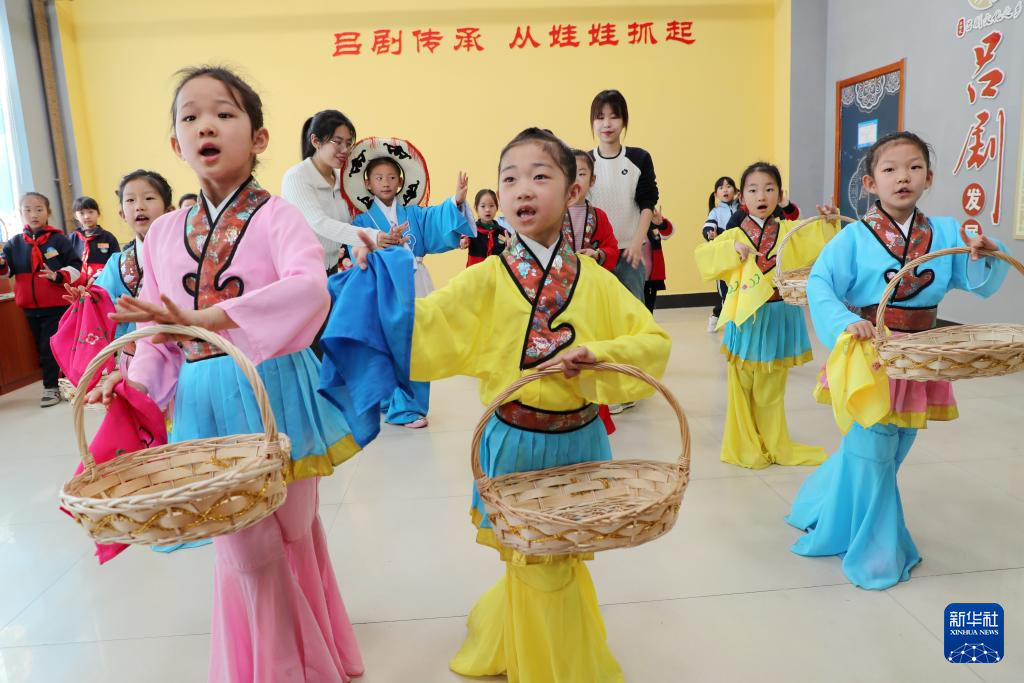 3月26日,在河北省石家莊市欒城區三蘇小學,石家莊市欒城區絲弦劇團的演員指導學生學習唱腔和表演技巧。
