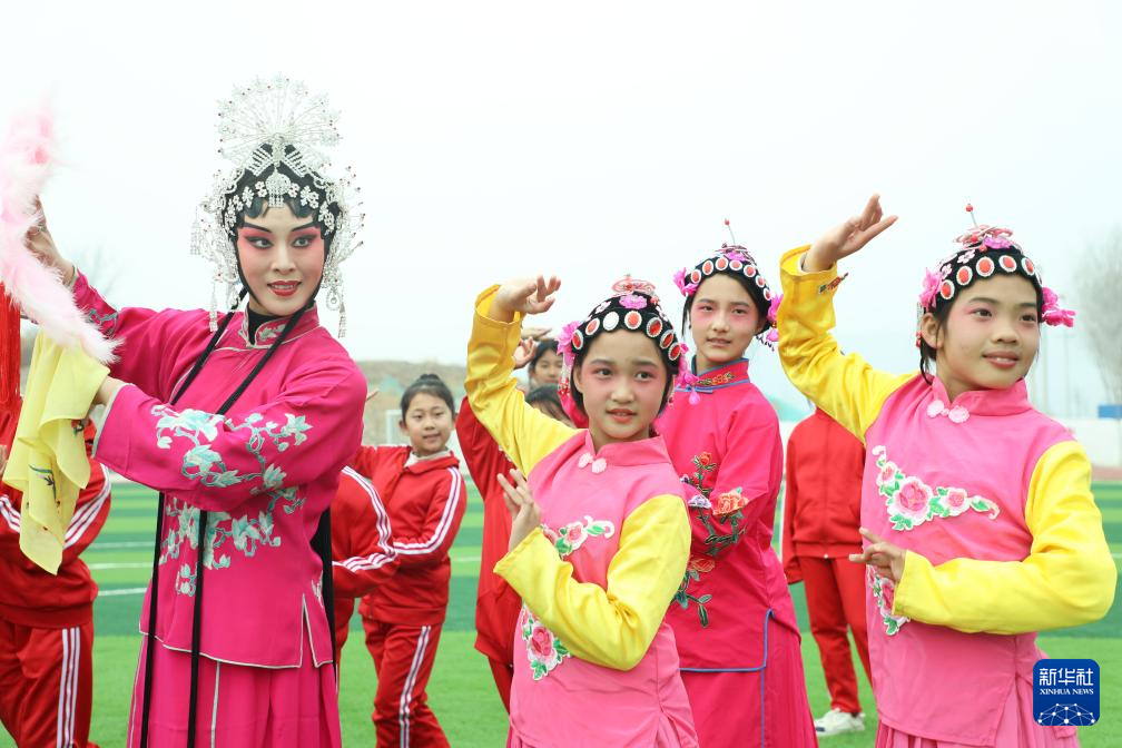 3月26日,在河北省唐山市豐潤區泉河頭鎮團山子小學,評劇演員在教學生戲曲動作。