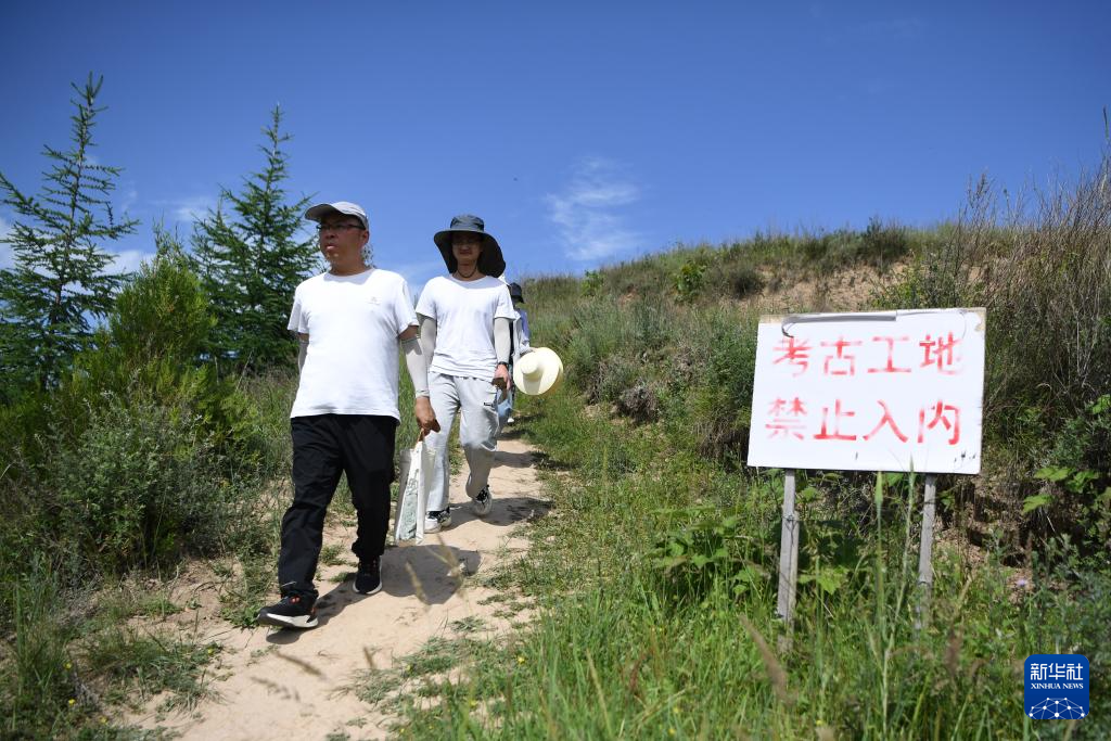 四角坪遺址考古領隊、甘肅省文物考古研究所副研究館員侯紅偉(前)帶領考古專業研究生在甘肅省隴南市禮縣四角坪遺址考古發掘現場工作(2022年6月10日攝)。