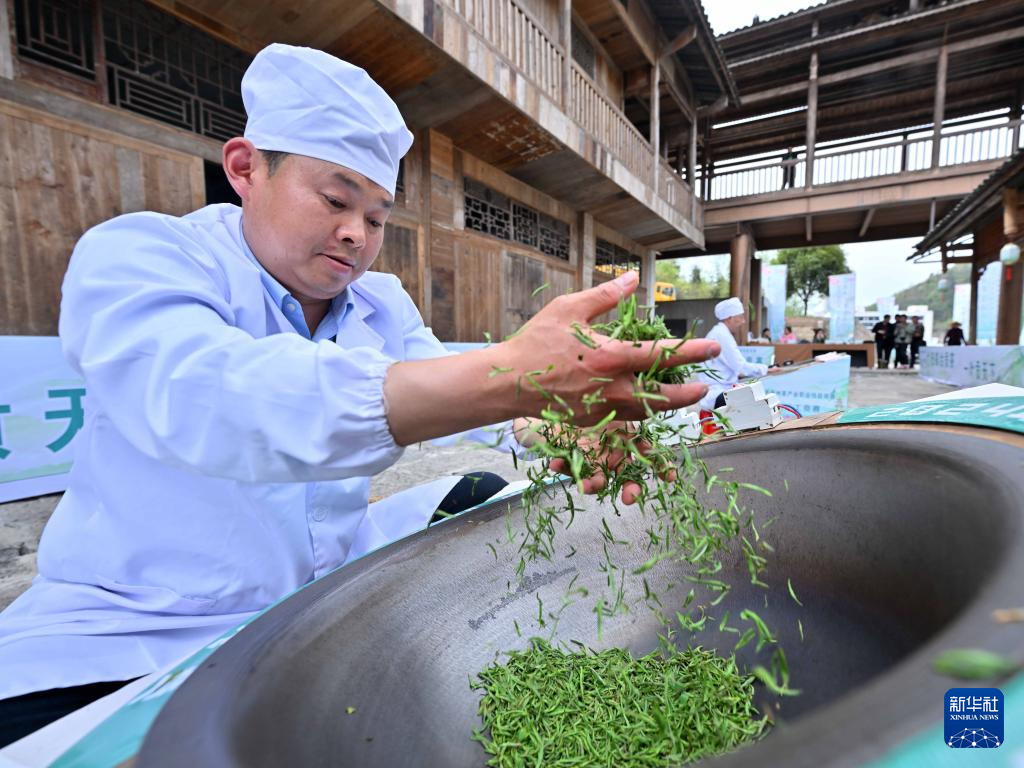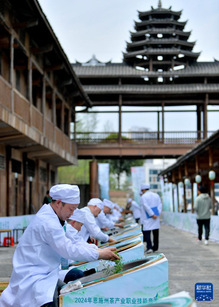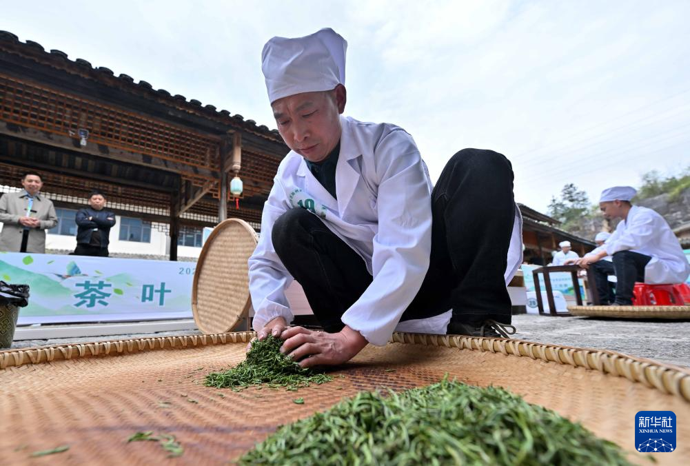 春茶采摘時節,湖北省恩施土家族苗族自治州宣恩縣組織開展手工制茶大賽。制茶師們采用被列入湖北省非物質文化遺產名錄的伍家臺貢茶制作技藝比賽手工制茶。伍家臺貢茶因清朝乾隆皇帝賜匾“皇恩寵錫”而聞名,制作工藝包括采摘鮮葉、攤放、殺青、揉捻、作形、干燥、提香等多道工序。宣恩縣茶葉種植約24萬畝,已形成賞茶、采茶、制茶、品茶等為一體的貢茶文化旅游經濟帶。
